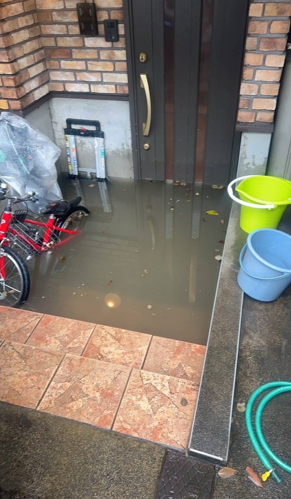 玄関ポーチ部分まで雨水が流入し、そのまま室内へ浸水する被害が発生しました。